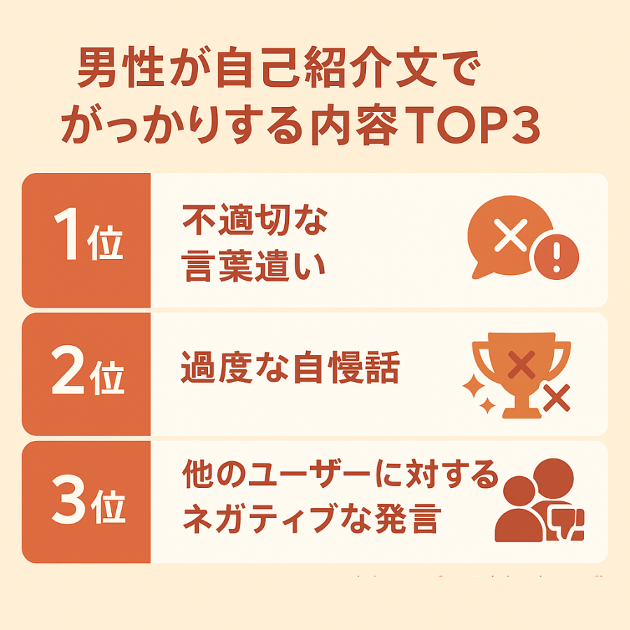 編集部の調査によると、プロフィール文章を読んだ際に、相手への興味を失う要素を調べてみると、1位は「不適切な言葉遣い(26.1%)」、2位は「過度な自慢話(18.8%)」、3位は「他のユーザーに対するネガティブな発言(15.2%)」という結果でした。