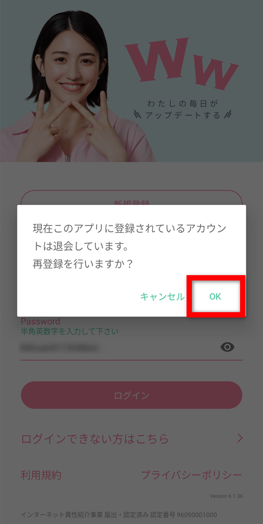 電話番号とパスワードが合っていれば、「現在このアプリに登録されているアカウントは退会しています。再登録を行いますか?」のポップアップが表示されます。「OK」をタップしましょう。