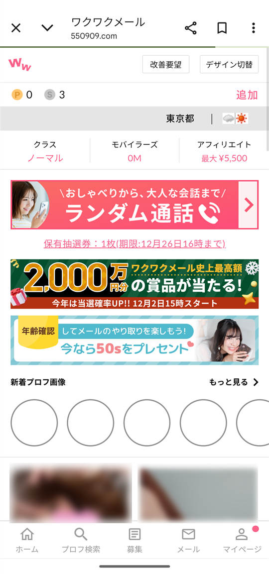 『ワクワクメール』に登録している「電話番号/メールアドレス」と「パスワード」を入力するとログイン完了。Web版のトップページが表示されます。