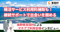 出会いコンパス編集部による、マッチングアプリを活用した婚活支援事業に取り組む自治体へのインタビュー。 今回ご紹介する長野県宮田村では、結婚を希望する村内在住の独身者を対象に、マッチングアプリや結婚相談所など婚活サービスの利用料を補助する、全国的にも珍しい施策を行っています。結婚意欲のある若い世代が、安心して出会いの機会を広げられるよう後押しする取り組みです。 さらに、経験豊富な相談員による個別相談や、電話・LINEを活用した継続的なサポートも実施。民間サービスとの連携を活かしながら、「出会いのきっかけ」をつくる環境づくりを進めています。 出会いコンパスでは、宮田村みらい創造課の貝瀬さんに、これらの取り組みの内容や目的、利用者の声、今後の展望について詳しく伺いました。 これから宮田村の支援を利用して婚活を考えている方は、ぜひ参考にしてみてください。