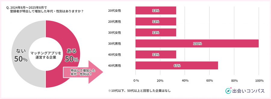 いずれかの年代・性別の登録者が特出して増加したという企業は半数。その中で、全ての企業が30代男性の利用者数が特出して増えたと回答。67%の企業が40代男性が特出して増えたと回答しました。