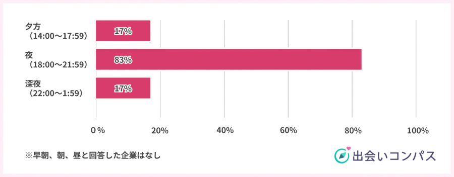 一方で「夕方(14:00〜17:59)」や「深夜(22:00〜1:59)」をピークと答える企業もあり、帰宅途中の移動時間や就寝前のリラックスタイムなどに利用している人も多いことが予想されます。