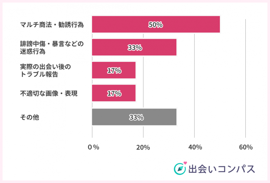 通報理由として最も多く挙げられたのは「マルチ商法・勧誘行為」で、続いて「誹謗中傷・暴言などの迷惑行為」も複数の企業が指摘しており、アプリ内でのやり取りの質に関する課題がうかがえます。